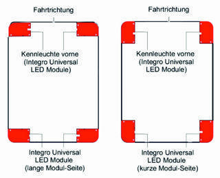 Die LED Module können vorne und/oder hinten am Sonderfahrzeug befestigt bzw. in den Dachaufbau des Fahrzeuges integriert werden- Ein Paar Integro LED-Module (vorne oder hinten) kann durch eine Rundum-Kennleuchte oder ein Dachbalkensystem ersetzt werden